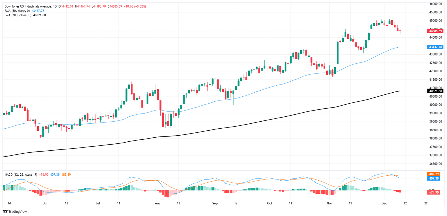 El Dow Jones ha cerrado silenciosamente a la baja durante tres días consecutivos de negociación cuando nadie estaba mirando, arrastrando la acción del precio intradía por debajo de 44.400 después de probar máximos históricos por encima de 45.000 la semana pasada. A pesar de la caída a corto plazo, los precios permanecen firmemente arraigados en el extremo superior, con ofertas flotando bien por encima de la media móvil exponencial (EMA) de 50 días cerca de 43.437.