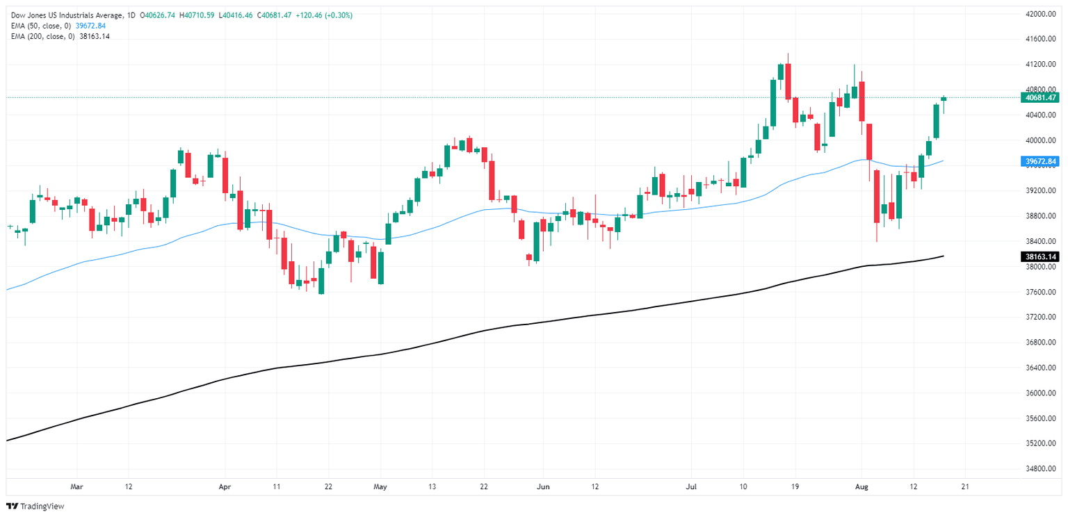 El Dow Jones está tocando una ganancia del 3% en una sola semana el viernes, listo para anotar la mejor actuación semanal del índice en 2024. Los máximos históricos de 41.371,38 establecidos a mediados de julio han vuelto a estar en la mira de los postores a medida que los precios del DJIA se abren camino de regreso al lado alto después de la breve caída de la semana pasada por debajo de 38.500,00.