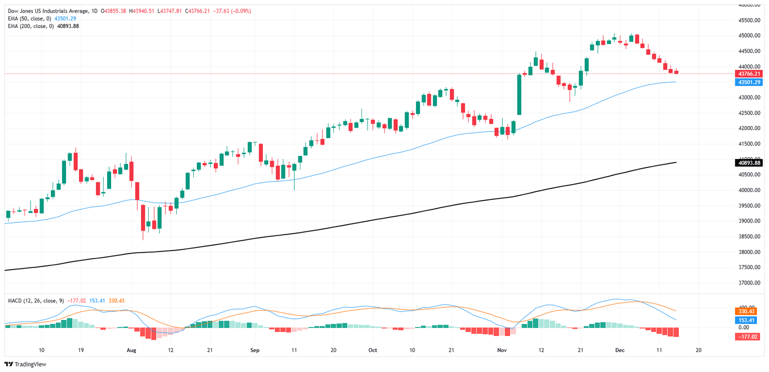 El Promedio Industrial Dow Jones (DJIA) continúa girando en el extremo inferior de la acción reciente del gráfico, con el principal índice bursátil atascado cerca de 43.800. Los inversores se están preparando para la última reunión de política monetaria del año de la Reserva Federal (Fed), con la expectativa generalizada de que el banco central de EE.UU. entregue un último recorte de tasas de un cuarto de punto antes de que los inversores lo den por terminado para la temporada navideña.