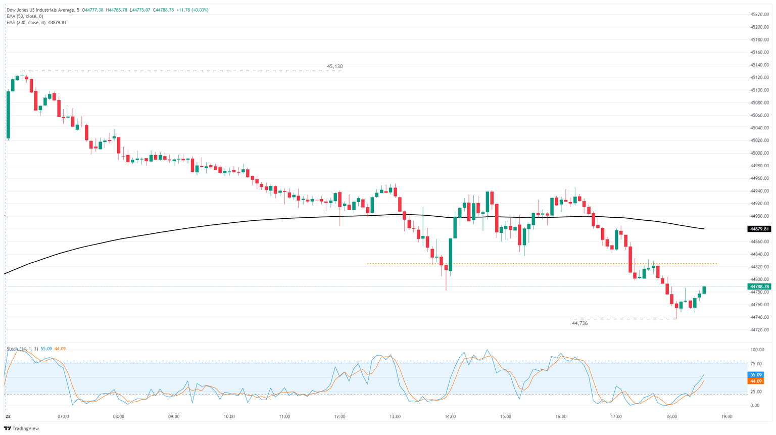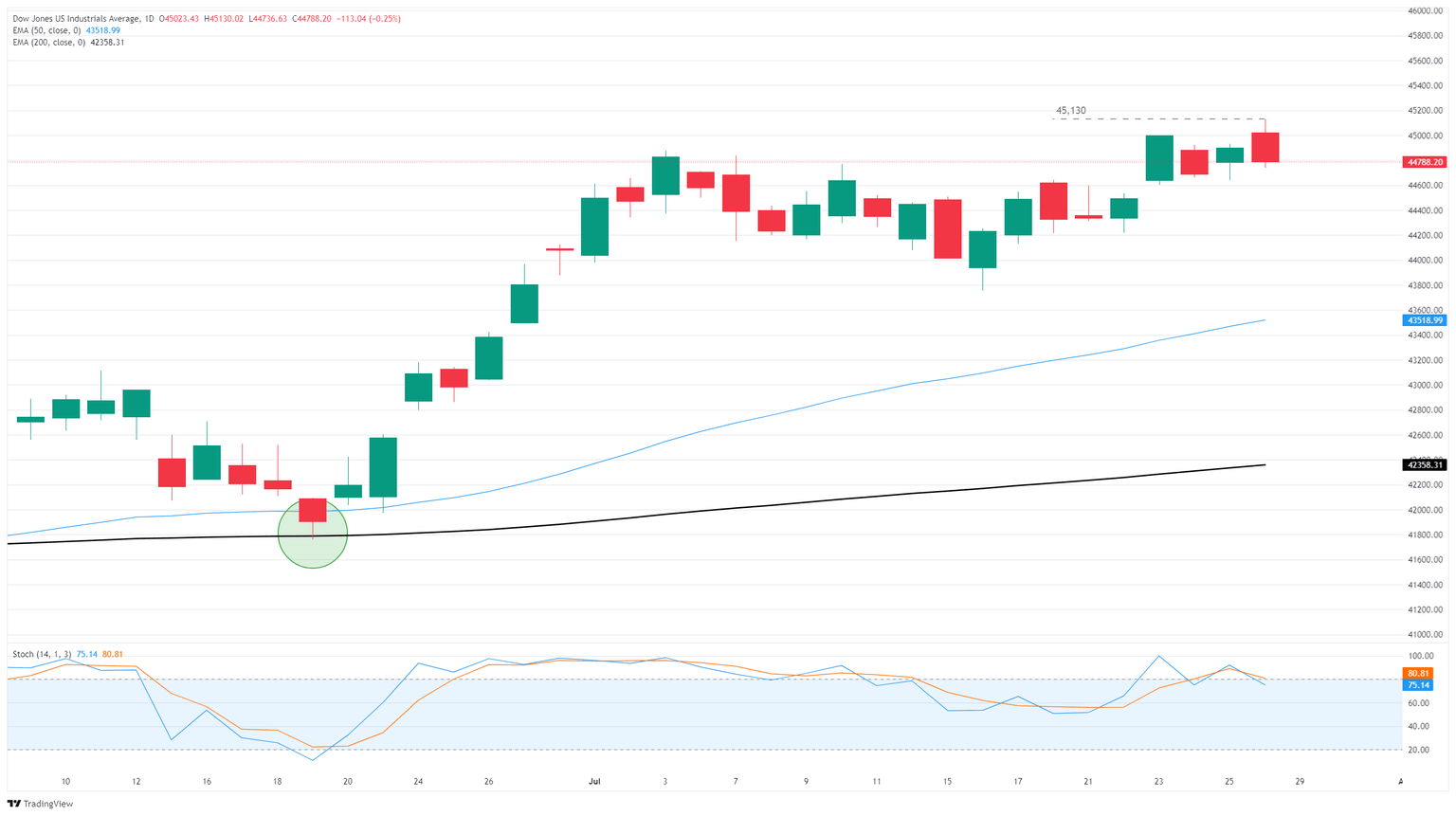 El Dow Jones alcanzó un máximo histórico en las operaciones intradía el lunes, tocando 45.130 por primera vez antes de caer de nuevo en la congestión de la semana pasada. El DJIA ahora está luchando cerca de 44.750 mientras los inversores se preparan para una semana cargada de datos y ganancias. El Dow sigue profundamente en territorio alcista, con un aumento de más del 22% desde la caída bajista impulsada por aranceles de abril a 36.615.