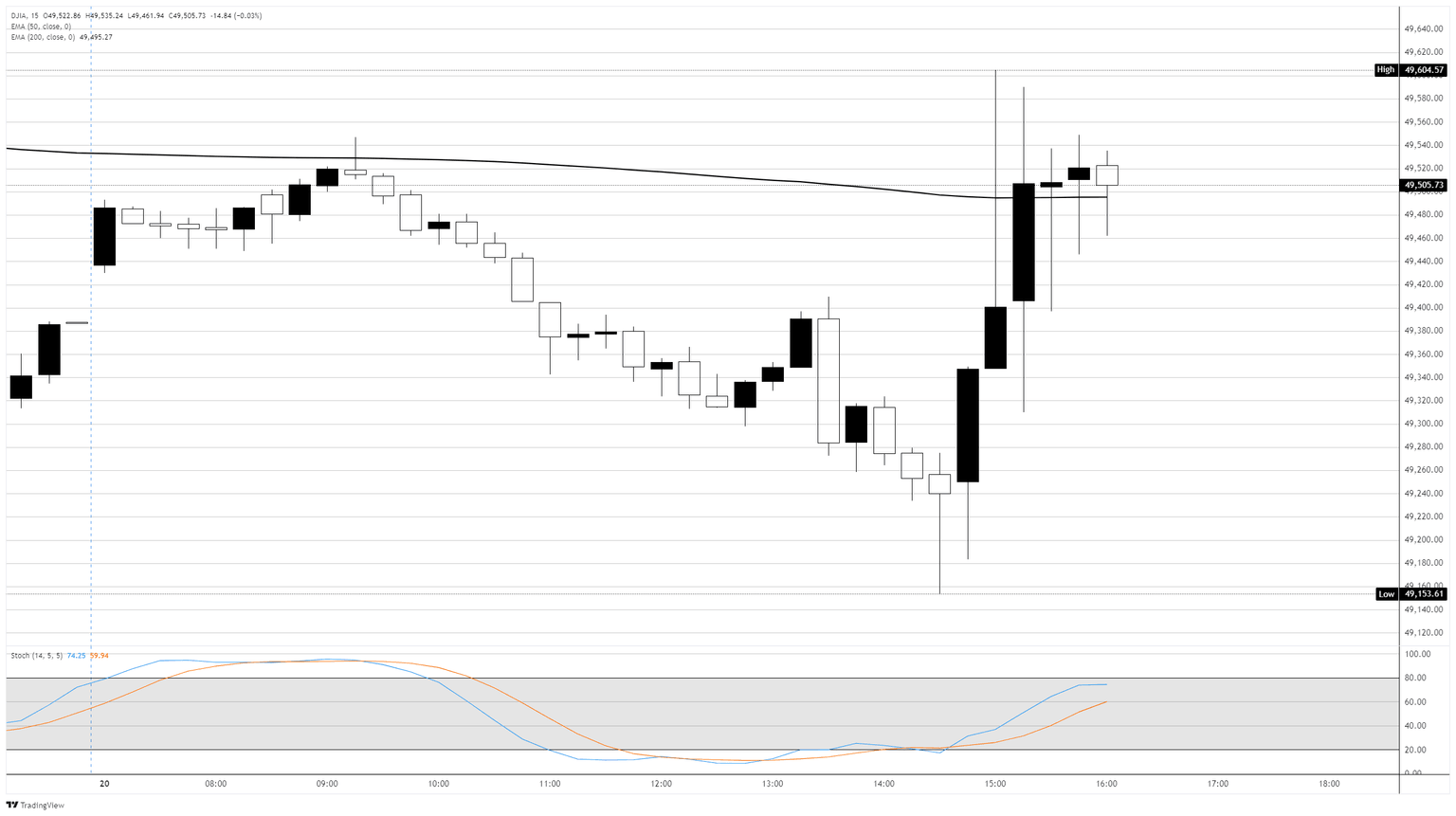 El Promedio Industrial Dow Jones (DJIA) revirtió las pérdidas de la sesión matutina el viernes después de que la Corte Suprema de EE.UU. anulara los amplios aranceles del presidente Trump en una decisión histórica de 6-3. El Dow subió 207 puntos, o un 0.42%, para cotizar cerca de 49,600 después de caer más de 200 puntos en las primeras operaciones debido a datos económicos decepcionantes. El S&P 500 ganó un 0.52% hasta 6,895 y el Nasdaq Composite subió un 0.68% hasta 22,837. Los ETFs con alta exposición al retail, como el SPDR S&P Retail ETF (XRT), se dispararon brevemente un 1.8% inmediatamente después de la decisión, con las empresas más afectadas por los aranceles liderando el avance.