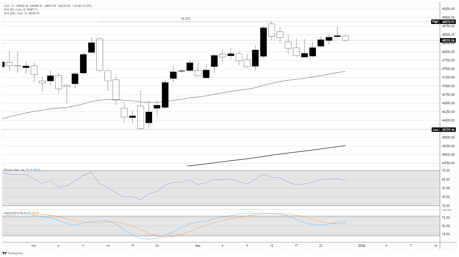 El Promedio Industrial Dow Jones (DJIA) se debilitó el martes, cayendo alrededor de 100 puntos mientras las acciones lidian con flujos de mercado limitados por las vacaciones y bajos volúmenes de negociación de fin de año. Las ganancias moderadas en las acciones del sector energético fueron compensadas por la debilidad en los sectores de salud y servicios financieros.