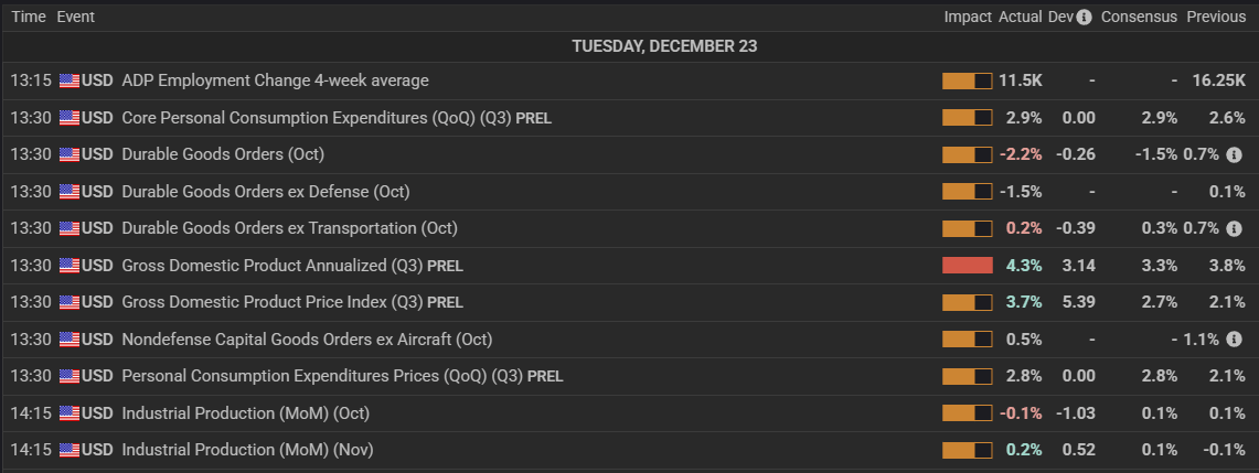 Los mercados digirieron un informe económico retrasado pero muy esperado que mostraba que el crecimiento del Producto Interior Bruto (PIB) de EE.UU. se expandió a un ritmo anualizado del 4.3% en el tercer trimestre, superando significativamente las expectativas. El crecimiento fue impulsado por un gasto del consumidor resiliente, que se aceleró respecto al trimestre anterior. La sorpresa al alza inquietó brevemente a los mercados al inicio de la sesión, ya que los inversores reevaluaron cuán rápido podría moverse la Reserva Federal (Fed) para bajar las tasas de interés. A pesar de esa vacilación inicial, las acciones se recuperaron a medida que los operadores mantuvieron la confianza en que múltiples recortes de tasas siguen siendo probables el próximo año.
