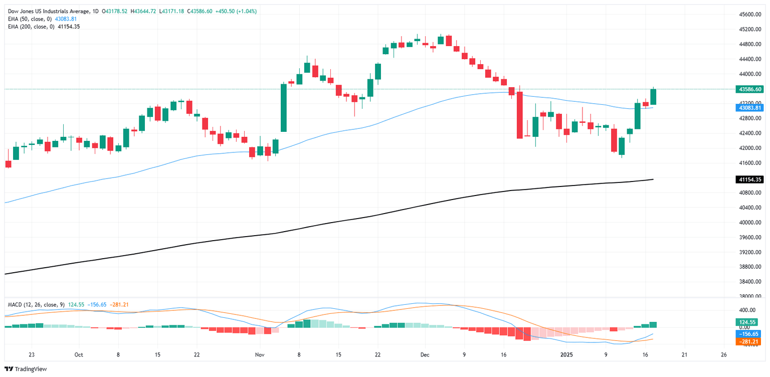 Los bajistas simplemente no pueden tener nada bueno. El Dow Jones está nuevamente por encima del promedio móvil exponencial (EMA) de 50 días, y los alcistas ahora pueden respirar aliviados. El principal índice de acciones aún tiene un largo camino por recorrer para recuperar los máximos históricos establecidos por encima de 45.000 el pasado diciembre, pero los postores estarán felices con una ganancia del 4% en una sola semana.