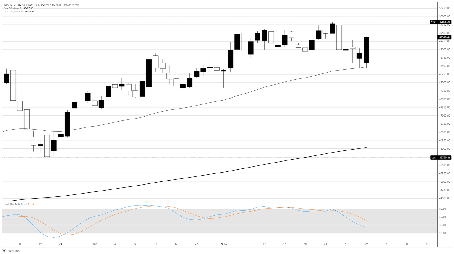 El Promedio Industrial Dow Jones (DJIA) saltó 504 puntos, o un 1%, el lunes, ya que Wall Street comenzó febrero con una nota fuerte, dejando de lado las preocupaciones por la caída de los metales preciosos de la semana pasada. El S&P 500 subió un 0.7%, impulsado por las ganancias en las acciones de Oracle Corporation (ORCL) tras el anuncio de la compañía de un masivo plan de financiamiento para la expansión de la nube. El Nasdaq Composite ganó un 0.8%. Los inversores pasaron por alto las recientes pérdidas en plata y bitcoin para centrarse en los datos de manufactura optimistas y una sólida temporada de ganancias, con estrategas señalando que el crecimiento de ganancias de dos dígitos por quinto trimestre consecutivo podría ayudar a aliviar las preocupaciones sobre la valoración.