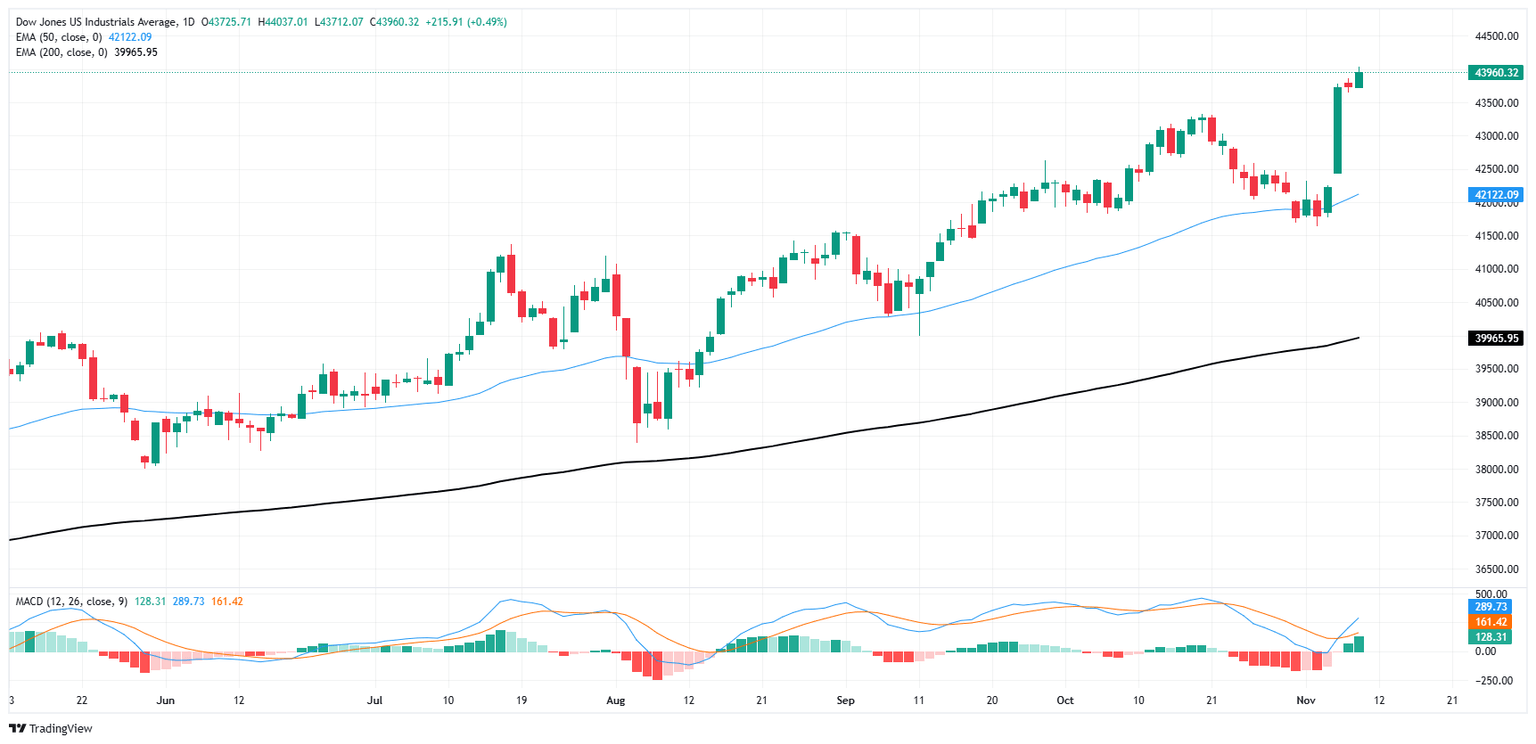 "Los ganadores siguen ganando" es el enfoque para una tendencia alcista a largo plazo del Dow Jones. El índice de acciones principal ha superado completamente su propia Media Móvil Exponencial (EMA) de 200 días durante todo un año. A pesar de una breve pausa en octubre, el Dow Jones ha continuado su inclinación alcista unilateral, cerrando en verde en todos menos dos de los últimos 11 meses consecutivos y en camino de registrar otro mes de ganancias en noviembre siempre que los postores mantengan su equilibrio.
