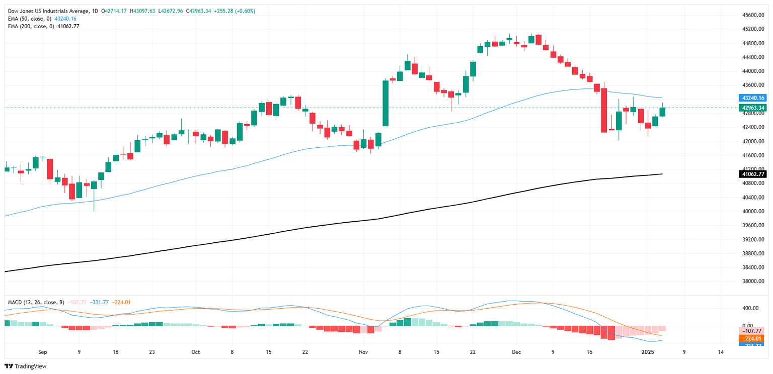 Después de un comienzo tibio del nuevo año de negociación, los toros están de vuelta en el bloque y el Dow Jones está siendo empujado nuevamente por encima de la zona de 43.000 mientras los postores intentan recuperar el terreno perdido tras la reciente caída del DJIA. El Dow Jones ha rebotado un 2.3% desde un mínimo de oscilación a corto plazo en la región de 42.000, pero los postores aún necesitan arrastrar la acción del precio por encima de la media móvil exponencial (EMA) de 50 días en 43.225 antes de que se pueda declarar renovado el mercado alcista.