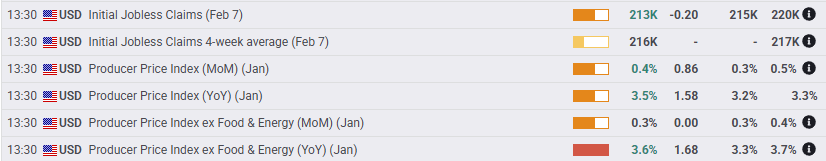 La inflación subyacente del IPP de EE.UU. se situó en 3.6% interanual en enero, muy por encima del pronóstico de 3.3%. El período anterior también vio una revisión al alza pronunciada a 3.7% desde 3.5%, pero la disminución general posterior a la revisión ayudó a calmar los temores del mercado sobre un resurgimiento de las presiones inflacionarias generalizadas. Según la herramienta FedWatch del CME, los mercados de tasas están ahora valorando mejores probabilidades de que la Fed entregue al menos un recorte de tasas de 25 pb en septiembre en comparación con el pronóstico del miércoles de diciembre.