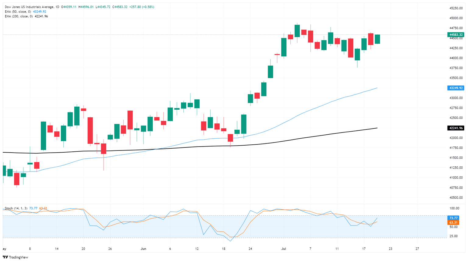 El último retroceso del precio del Dow Jones parece haber perdido impulso a medida que el momentum bajista lucha por encontrar un punto de apoyo. El Dow todavía está luchando por encontrar terreno fresco por encima de la zona principal de 45.000, pero la acción del precio también se muestra reacia a explorar territorio gráfico por debajo de 44.000 por el momento. El soporte técnico inmediato está fijado en la media móvil exponencial (EMA) de 50 días cerca de 43.250, con la EMA de 200 días estacionada mucho más abajo, justo al norte de 42.000.