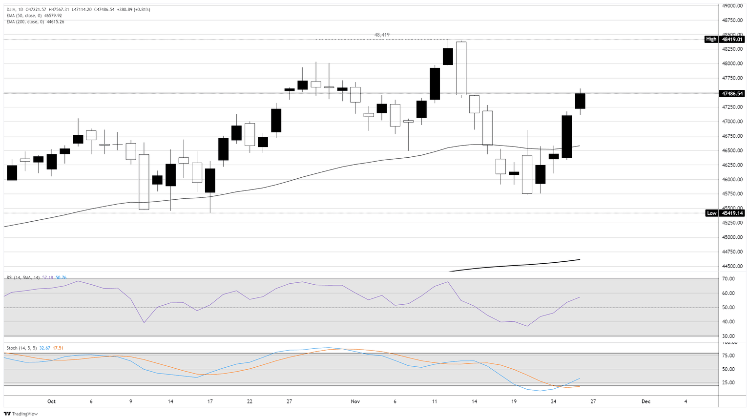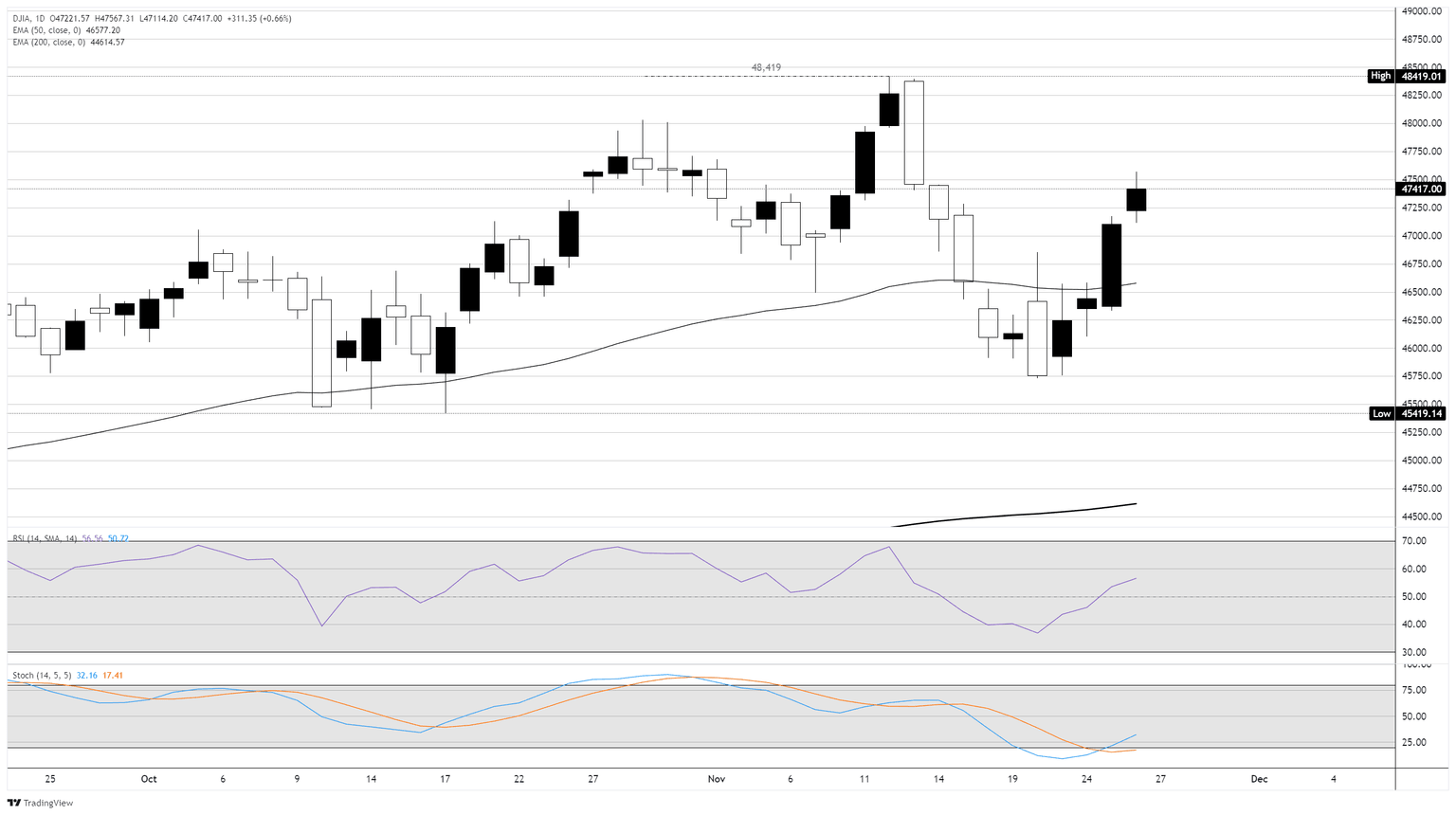 Tras una fuerte caída desde máximos históricos, el Dow está de vuelta en la delantera, subiendo un 4% desde el último mínimo en 45.730 a pesar de los recientes altibajos en el rally tecnológico liderado por la IA. Las acciones han recuperado en general las pérdidas que sacudieron a los operadores a mediados de noviembre, y las altas expectativas de nuevos recortes de tasas de interés de la Fed están impulsando las acciones y el sentimiento de los inversores al alza.