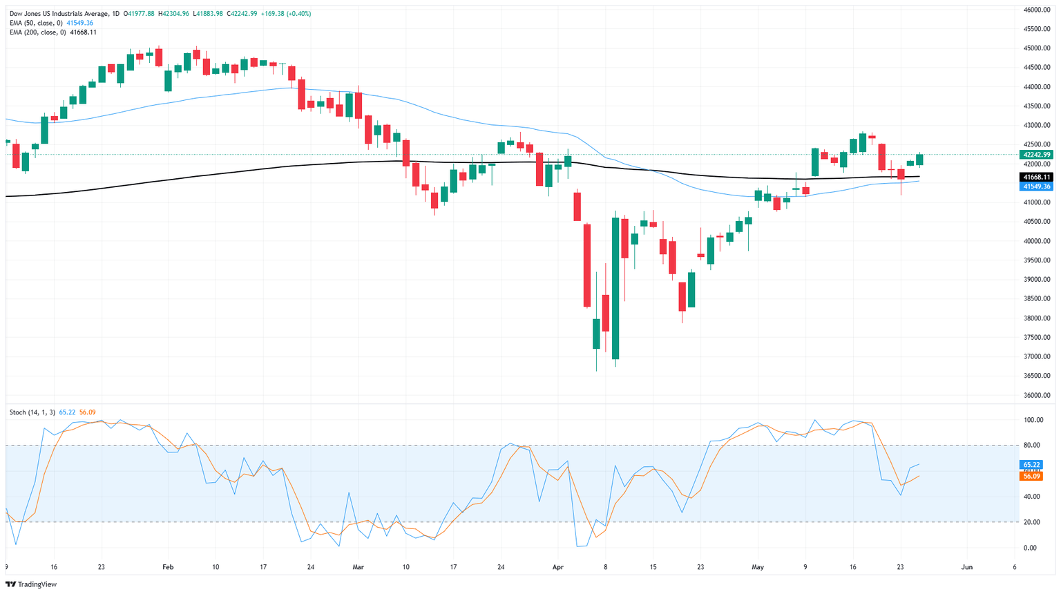 El Dow Jones ganó alrededor de 750 puntos desde el cierre del viernes pasado, formando un rechazo técnico de la media móvil exponencial (EMA) de 200 días y reclamando el nivel de 42,250 por tercera vez este mes. El índice de acciones principal sigue por debajo de sus máximos recientes cerca de la región de 42,800, pero el impulso favorece movimientos al alza adicionales.