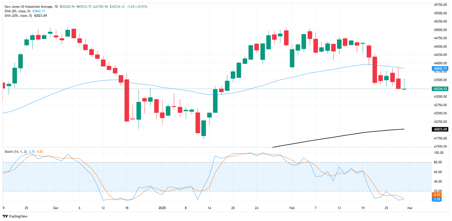 El Promedio Industrial Dow Jones (DJIA) recuperó parte del terreno perdido el viernes, rebotando alrededor de 150 puntos para mantenerse en contención con el nivel de 43.400. A pesar del intento alcista del viernes, el índice bursátil principal sigue a la baja desde los precios de apertura del lunes. El presidente de EE.UU., Donald Trump, tuvo una disputa con el presidente ucraniano Volodymyr Zelenskyy después de que el líder ucraniano se negara a firmar el acuerdo de defensa de Donald Trump sin hacer preguntas o buscar una aclaración ampliada sobre el contenido del muy deseado "acuerdo de tierras raras" del presidente Trump.