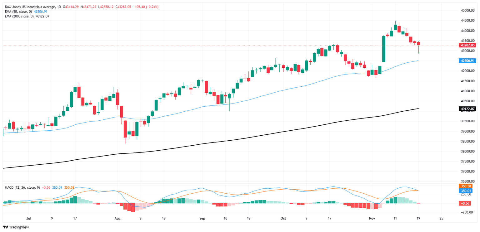 El Dow Jones exploró más a la baja el martes, cayendo a un mínimo intradía de 42.850 antes de recuperarse al rango de apertura del día justo al norte de 43.200. El índice principal de acciones está listo para cerrar a la baja por cuarto día consecutivo de operaciones mientras las acciones continúan enfriándose desde el frenesí postelectoral que envió las ofertas a nuevos máximos históricos.