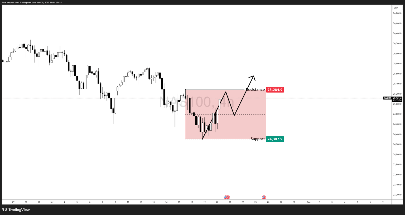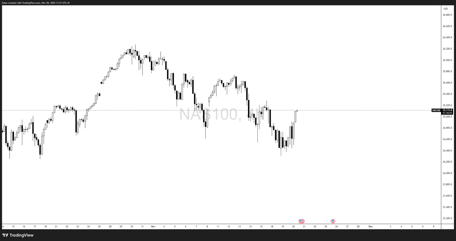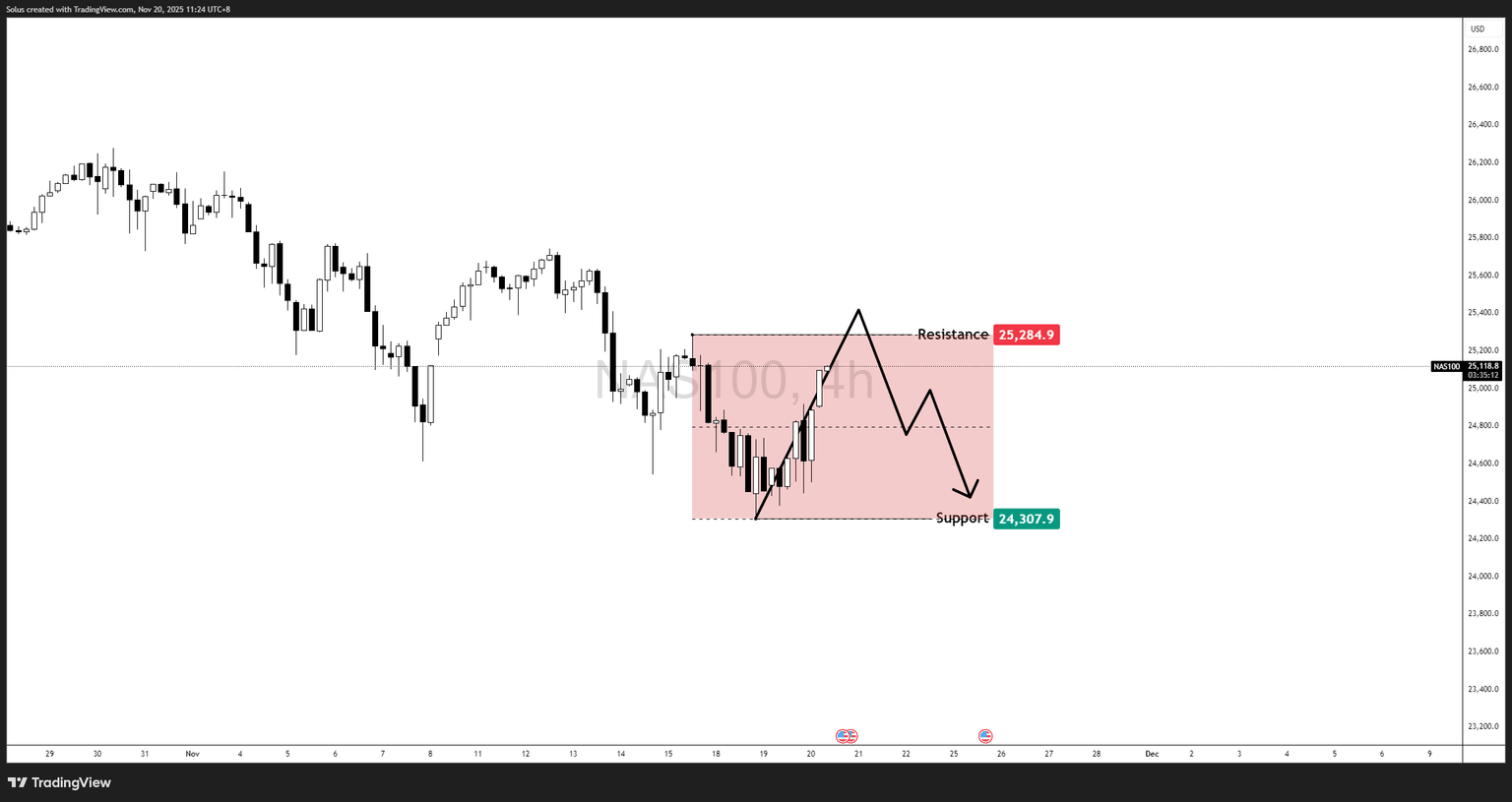 El Nasdaq 100 pasó las últimas sesiones recuperándose fuertemente de sus mínimos de noviembre, rebotando desde 24.307 y subiendo de nuevo a la zona media de 25.100–25.150. Aunque las velas parecen convincentes, la imagen más amplia revela una historia diferente: el índice sigue atrapado dentro de una estructura de rango de 4H, encerrado entre 24.307 (soporte) y 25.284 (resistencia).