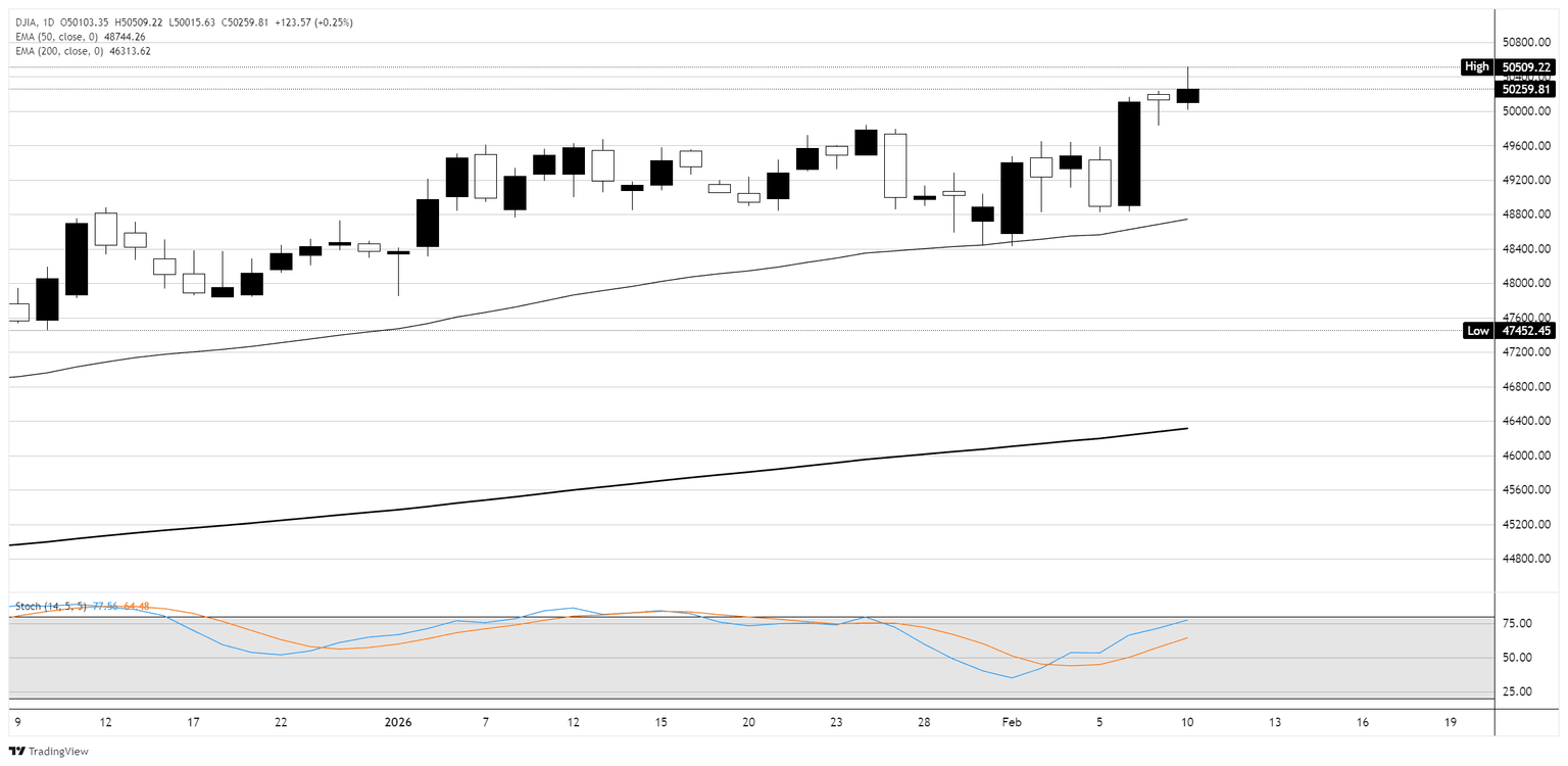 El Dow continúa operando en una fuerte tendencia alcista, con el máximo intradía del martes de 50.509,22 marcando una nueva oferta récord. El índice está cómodamente por encima de su EMA de 50 días en 48.744 y su EMA de 200 días en 46.314, reflejando un amplio impulso alcista. El oscilador estocástico se acerca a territorio de sobrecompra en 77.96/64.48, lo que podría señalar alguna consolidación a corto plazo. El soporte clave se sitúa en el nivel psicológico de 50.000, con la zona de ruptura anterior alrededor de 49.600 proporcionando un segundo piso. Hacia arriba, los operadores estarán atentos a un cierre sostenido por encima de 50.500 para confirmar la ruptura a nuevos máximos.