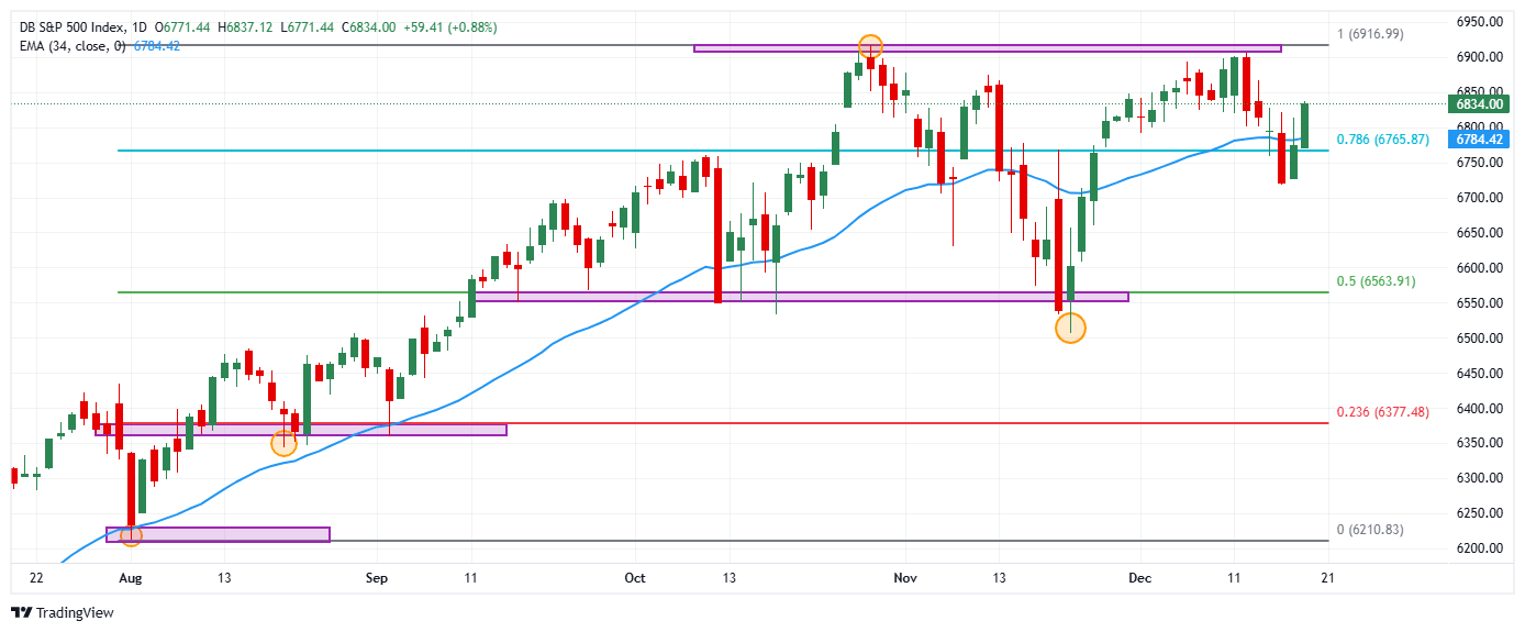 El S&P 500 registró un mínimo del día en 6.771, atrayendo compradores agresivos que impulsaron el índice a máximos del 15 de diciembre en 6.837. Actualmente, el S&P 500 sube un 0.86%, cotizando al momento de escribir en 6.835.