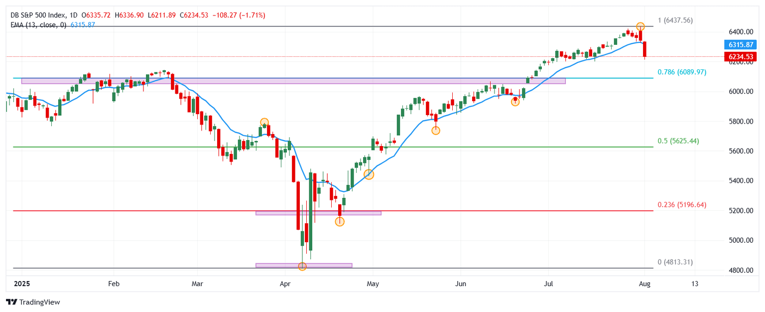 - El índice bursátil S&P 500 cae un 1.71% en la última jornada de la semana, llegando a mínimos no vistos desde el 16 de julio en 6.211.