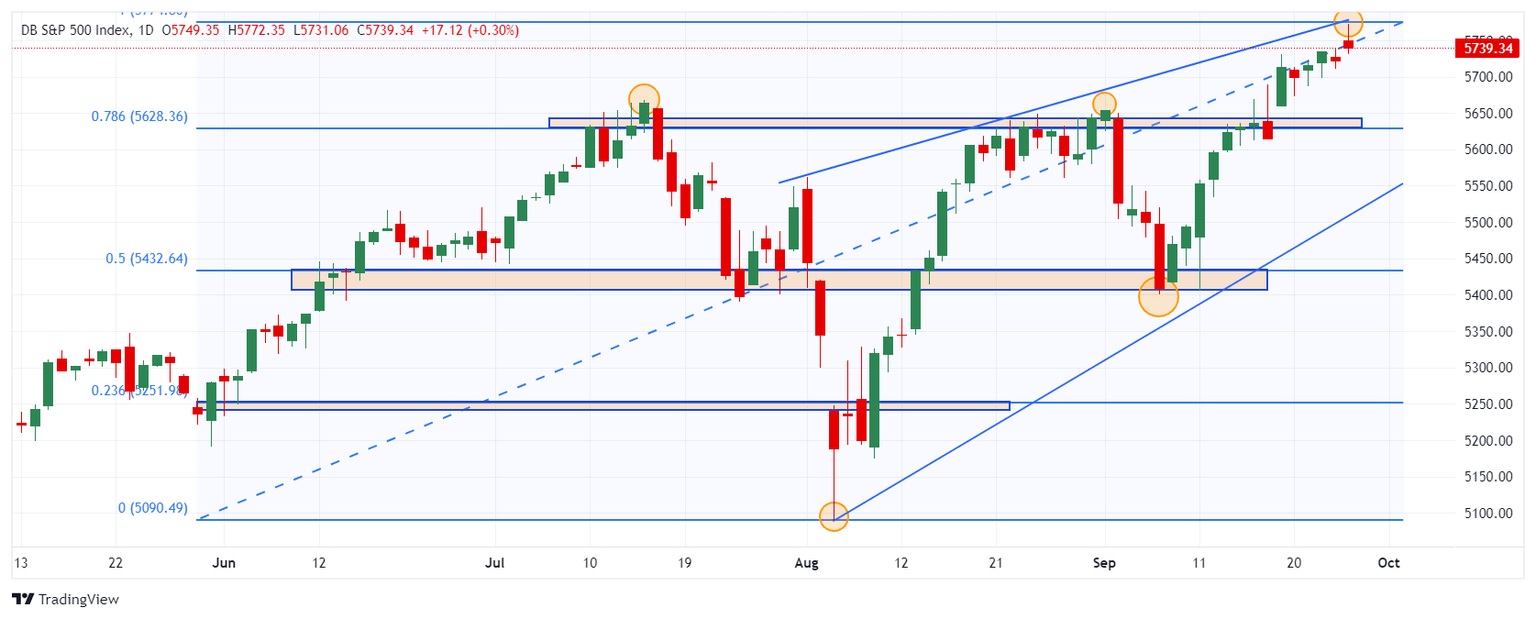 El S&P 500 marcó un nuevo máximo histórico en 5.772, encontrando vendedores agresivos que llevaron el índice a un mínimo del día en 5.745. Al momento de escribir, el S&P 500 opera en 5.730, subiendo un 0.17% diario.