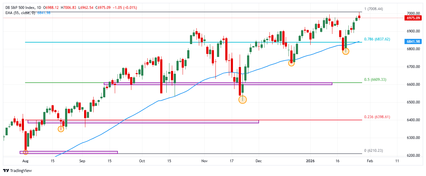 - El índice accionario S&P 500 cae marginalmente un 0.01% en el día tras alcanzar nuevos máximos históricos en 7.006.