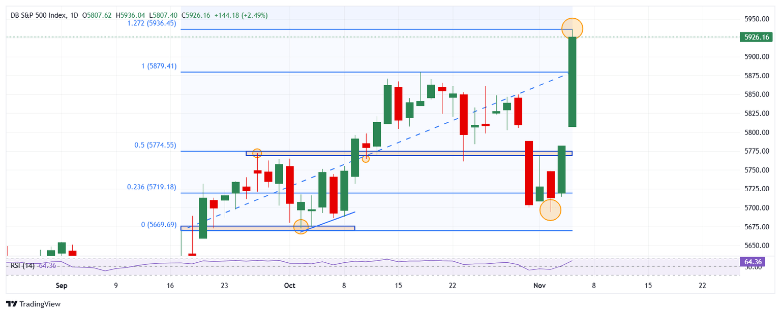 El S&P 500 estableció un mínimo del día en 5.807, donde atrajo compradores agresivos que impulsaron el índice a un nuevo máximo histórico en 5.933. Actualmente, el S&P 500 opera sobre 5.728, subiendo un 2.54% al finalizar la jornada.