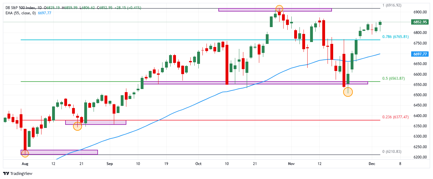 El S&P 500 registró un mínimo del día en 6.806, donde atrajo compradores agresivos que llevaron el índice a máximos del 13 de noviembre en 6.859. Actualmente, el S&P 500 cotiza sobre 6.856, ganando un 0.49% en la tercera jornada de la semana.