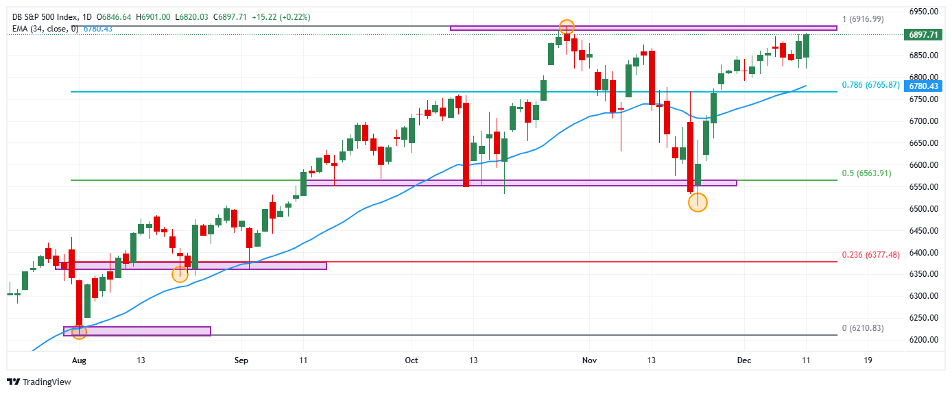 Ante este escenario, el S&P 500 avanza 16 puntos, alcanzando máximos del 29 de noviembre en 6.901.