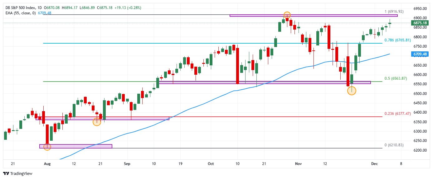 El S&P 500 estableció un mínimo del día en 6.846, encontrando compradores que impulsaron el índice a máximos no vistos desde el 30 de octubre en 6.894. Al momento de escribir, el S&P 500 avanza un 0.28%, cotizando actualmente sobre 6.875.