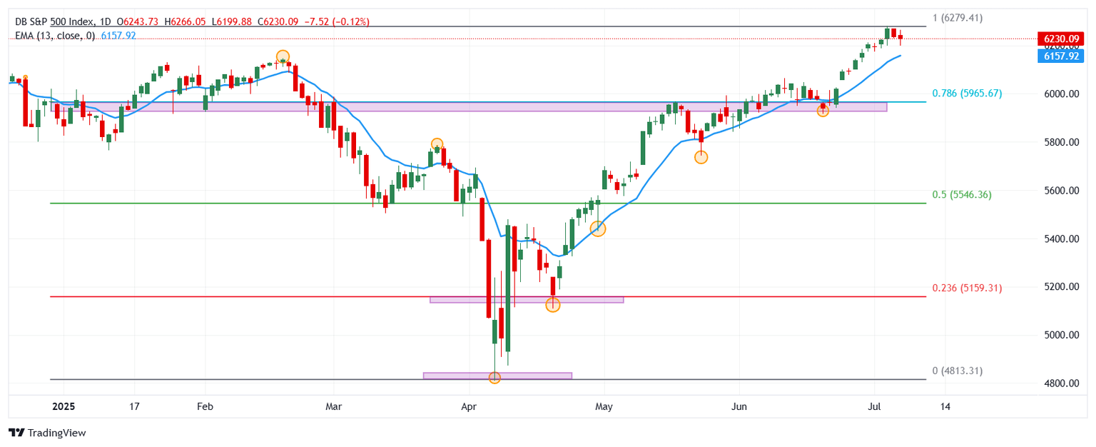 En este contexto, el S&P 500 retrocede 7 puntos diario, oscilando dentro del rango de la sesión del 3 de julio en 6.230.