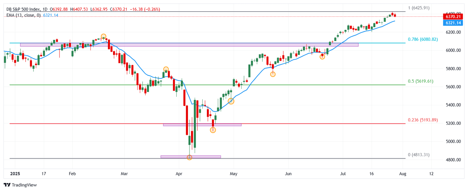 El S&P 500 estableció un máximo del día en 6.407, atrayendo vendedores que lastraron el índice a mínimos del 25 de julio en 6.362. Actualmente, el S&P 500 opera sobre 6.370 cayendo un 0.26% diario.