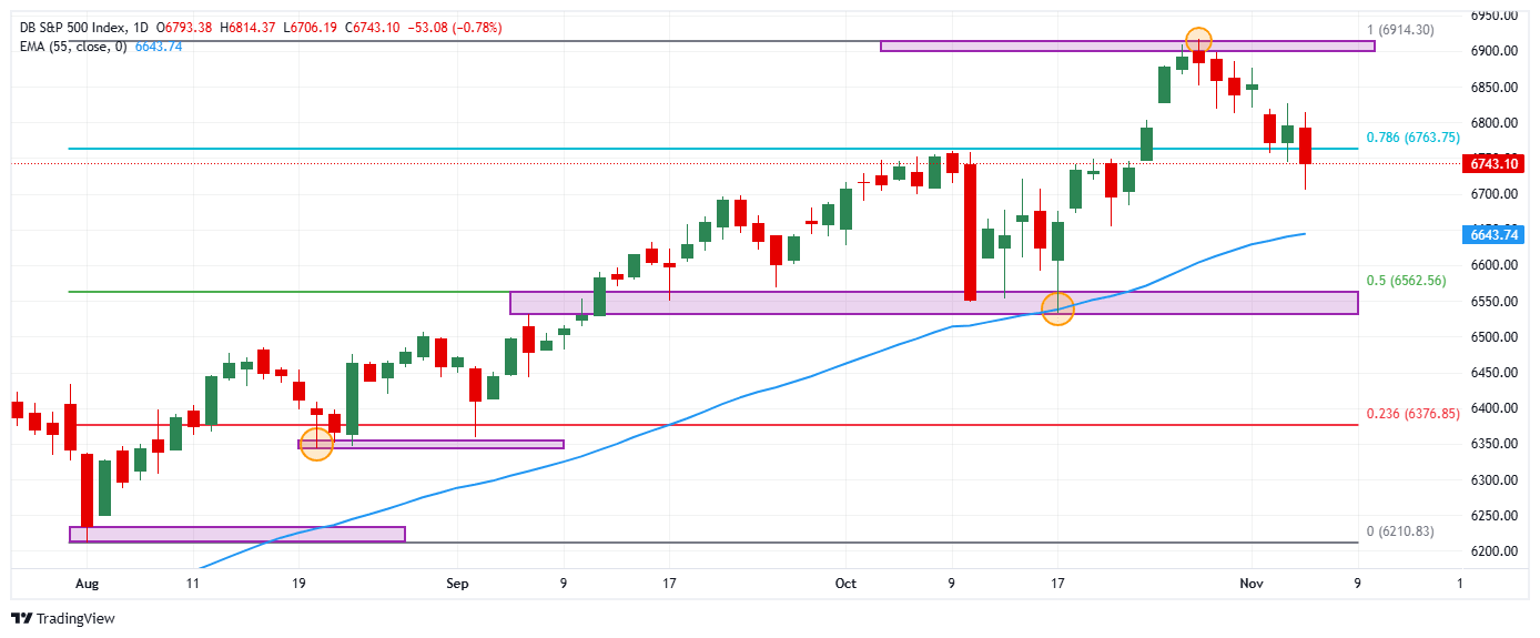 En este contexto, el S&P 500 cae 54 puntos, operando al momento de escribir en 6.740.