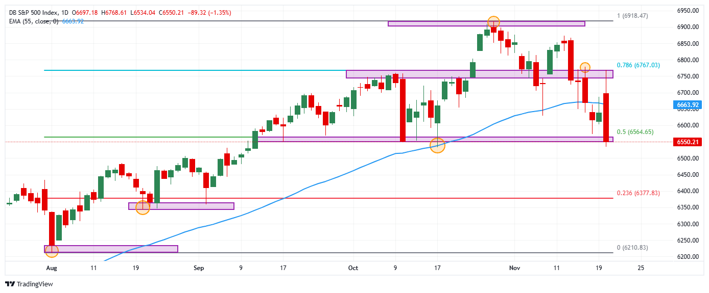 El S&P 500 registró un máximo diario en 6.768, encontrando vendedores agresivos que arrastraron el índice a mínimos del 17 de octubre en 6.534. Actualmente, el S&P 500 opera en 6.542, perdiendo un 1.45% en la jornada del jueves.