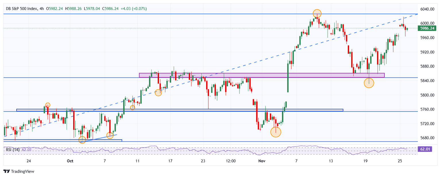 El S&P 500 formó un soporte de corto plazo en 5.830, dado por el mínimo del 19 de noviembre, cercano al nivel de retroceso del 50% de Fibonacci. La siguiente área clave de soporte se encuentra en 5.694, punto pivote del 4 de noviembre. La zona de resistencia importante está en 6.026, máximo histórico alcanzado el 11 de noviembre.