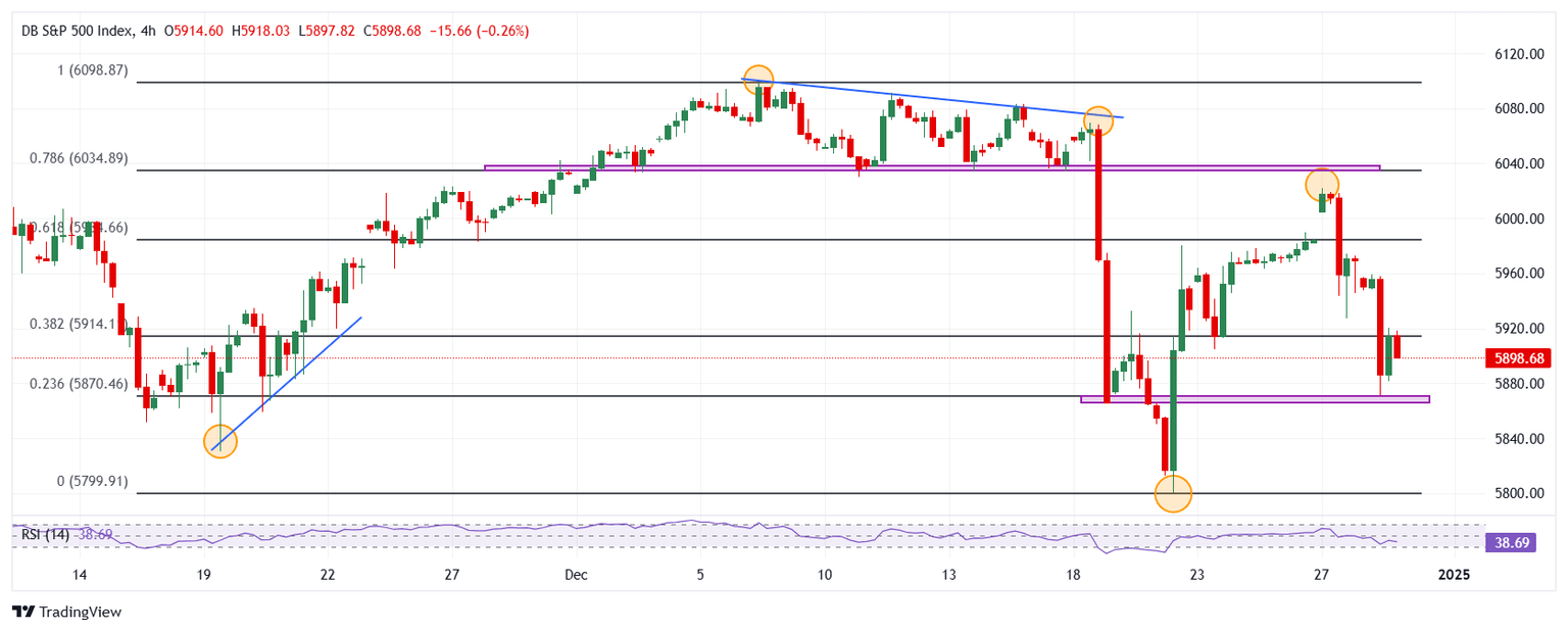 El S&P 500 reaccionó a la baja desde un máximo diario en 5.959, llegando a mínimos del 20 de diciembre en 5.871. Actualmente, el S&P 500 opera en 5.898 perdiendo un 1.18% en la jornada del lunes.