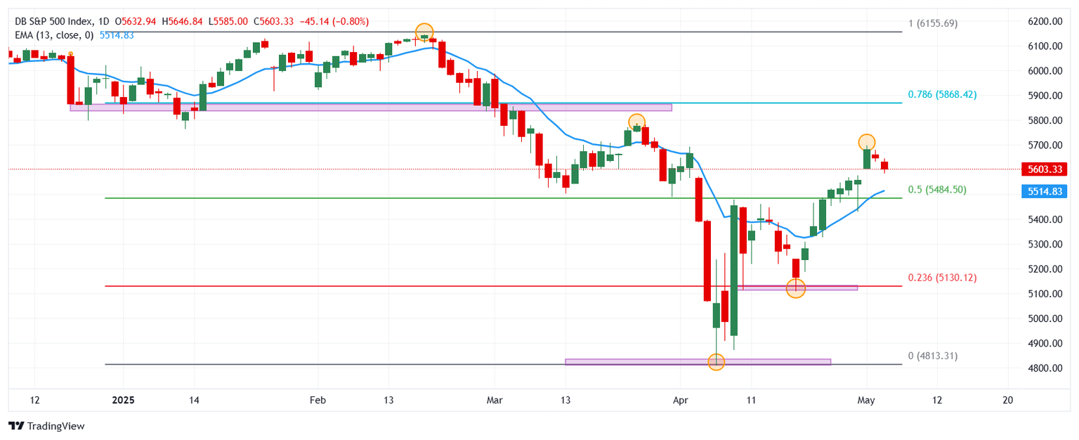 El S&P 500 estableció un máximo del día en 5.646, atrayendo vendedores que llevaron el índice a mínimos del 2 de mayo en 5.585. Actualmente, el S&P 500 cotiza en 5.603, perdiendo un 0.80% en la jornada del martes.