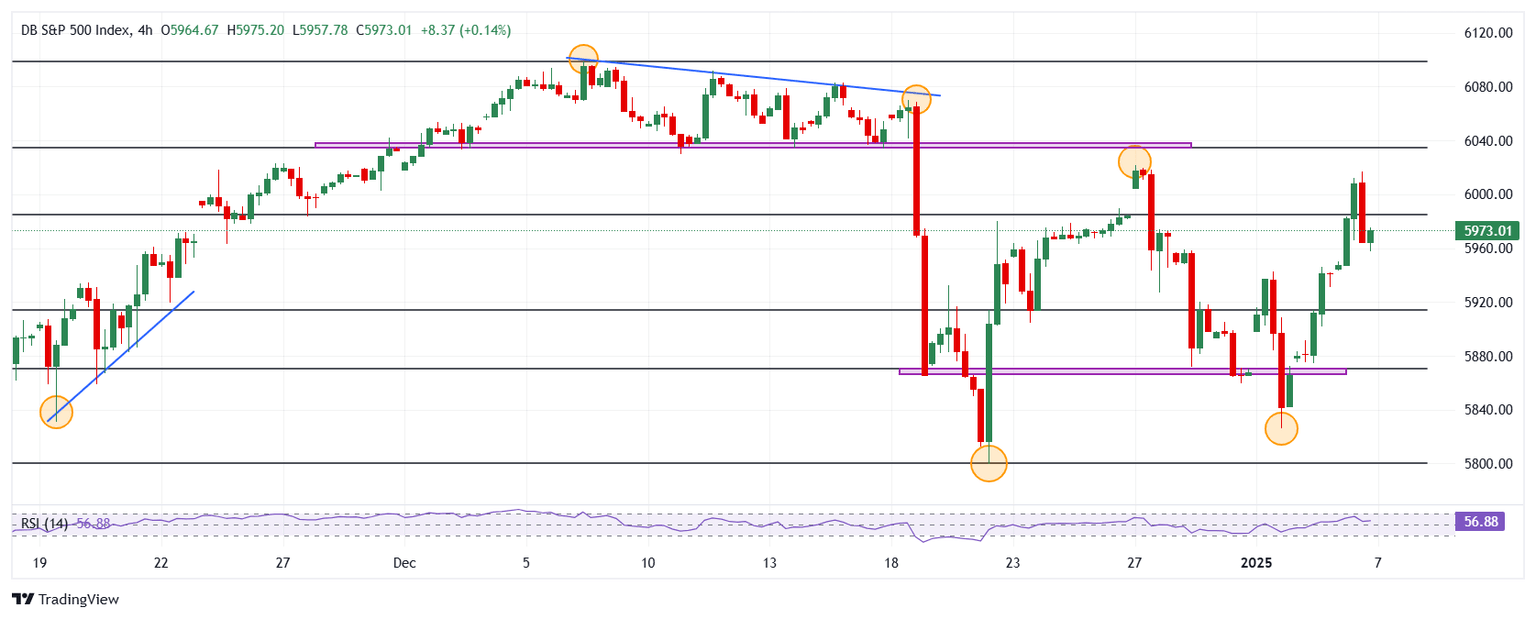 El S&P 500 marcó un mínimo del día en 5.943, donde atrajo compradores que impulsaron el índice a máximos del 27 de diciembre en 6.017. Actualmente, el S&P 500 opera en 5.973, ganando un 0.54% en el día.