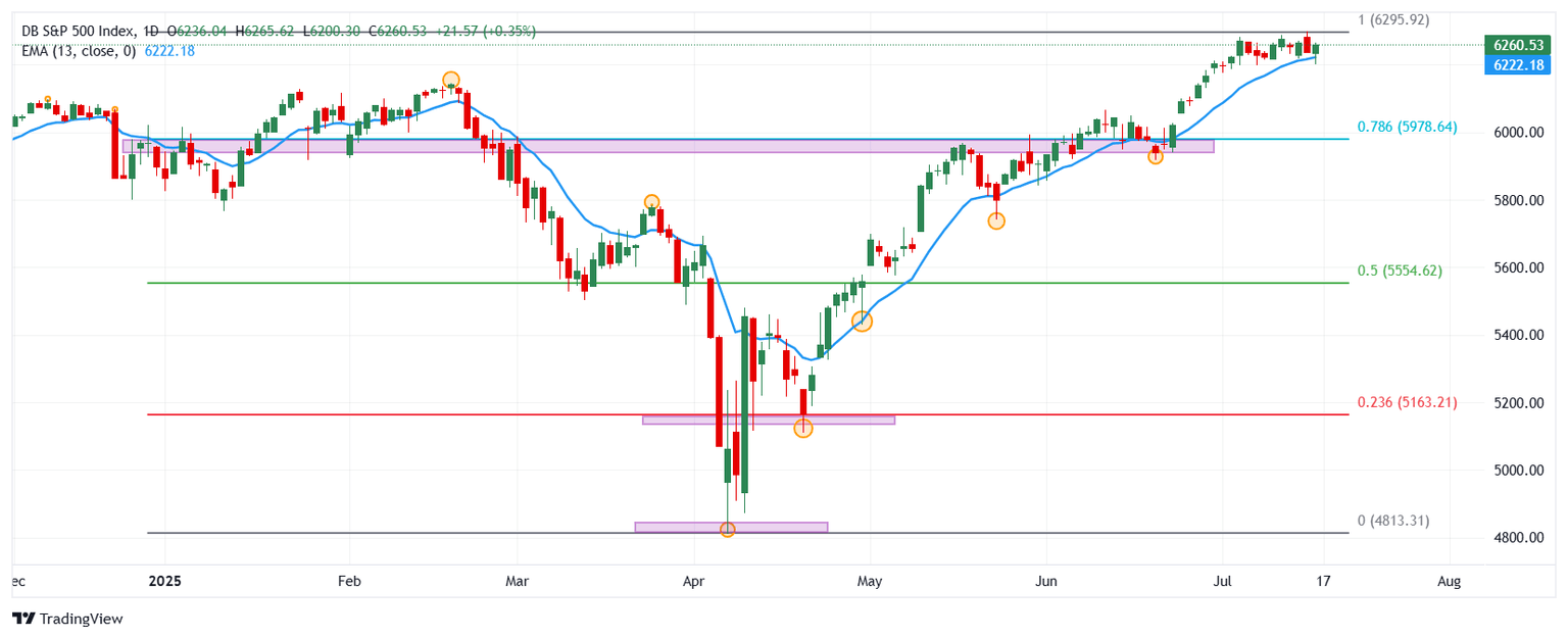 El S&P 500 reaccionó al alza desde mínimos del 7 de julio en 6.200, encontrando compradores que impulsaron el índice a un máximo diario en 6.265. Actualmente, el S&P 500 cotiza en 6.260, subiendo un 0.35% el día de hoy.