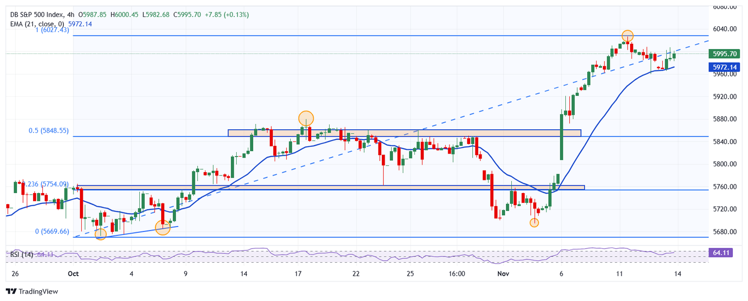 El S&P 500 marcó un mínimo diario en 5.965, encontrando compradores que llevaron el índice a un máximo del día en 6.007. Al momento de escribir, el S&P 500 opera en 5.986, ganando un 0.04% al cierre del mercado.