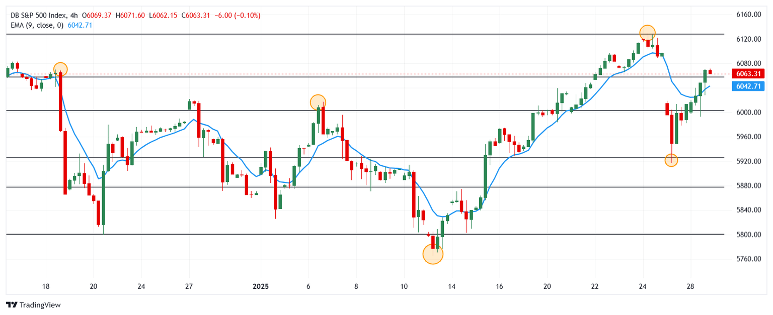 El S&P 500 estableció una resistencia de corto plazo dado por el máximo alcanzado el 24 de enero en 6.129. El soporte más cercano se encuentra en 5.916, mínimo del 27 de noviembre. La siguiente zona clave de soporte la observamos en 5.765, punto pivote del 13 de enero.
