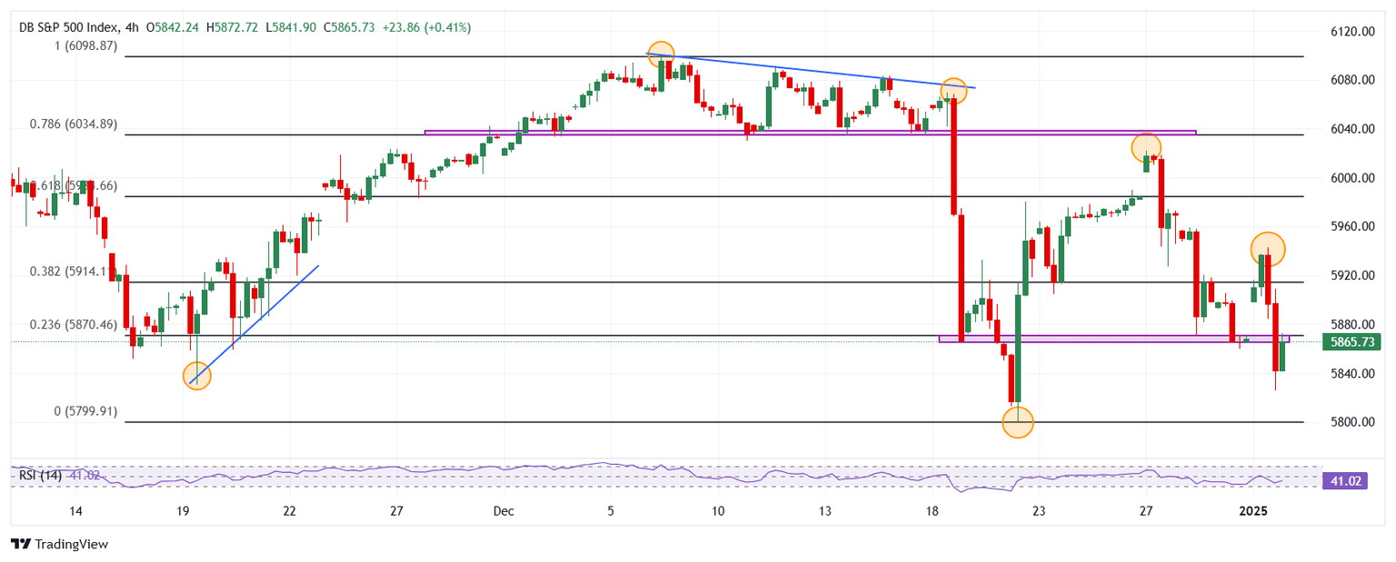 El S&P 500 reaccionó a la baja desde un máximo diario en 5.942, donde atrajo vendedores que lastraron el índice a un mínimo de dos semanas en 5.825. Actualmente, el S&P 500 opera en 5.865, cayendo un 0.56% en la primera jornada bursátil del año.
