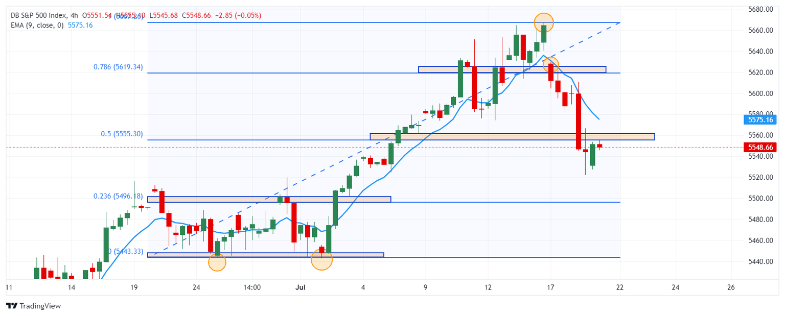 Observamos un primer soporte en 5.500, dado por el retroceso al 23.6% de Fibonacci. El siguiente soporte se encuentra en 5.543, mínimo del 25 de junio. La resistencia más cercana está en 5.620, en convergencia con el retroceso al 78.6% de de Fibonacci.