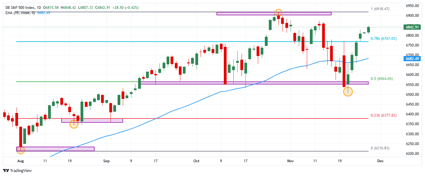 El S&P 500 estableció un mínimo del día en 6.807, encontrando compradores agresivos que impulsaron el índice a máximos del 13 de noviembre en 6.848.