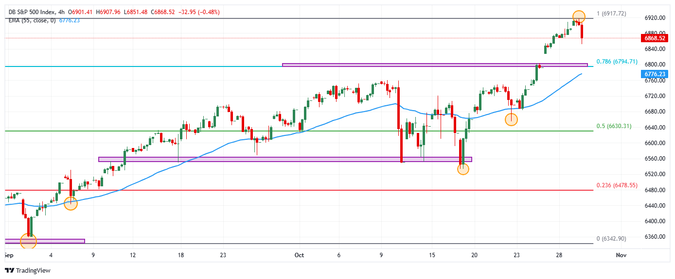 El S&P 500 registró un mínimo diario en 6.894, atrayendo compradores agresivos que impulsaron el índice a nuevos máximos históricos por cuarta sesión consecutiva en 6.917. Al momento de escribir, el S&P 500 cotiza sobre 6.898, subiendo un 0.10% diario.