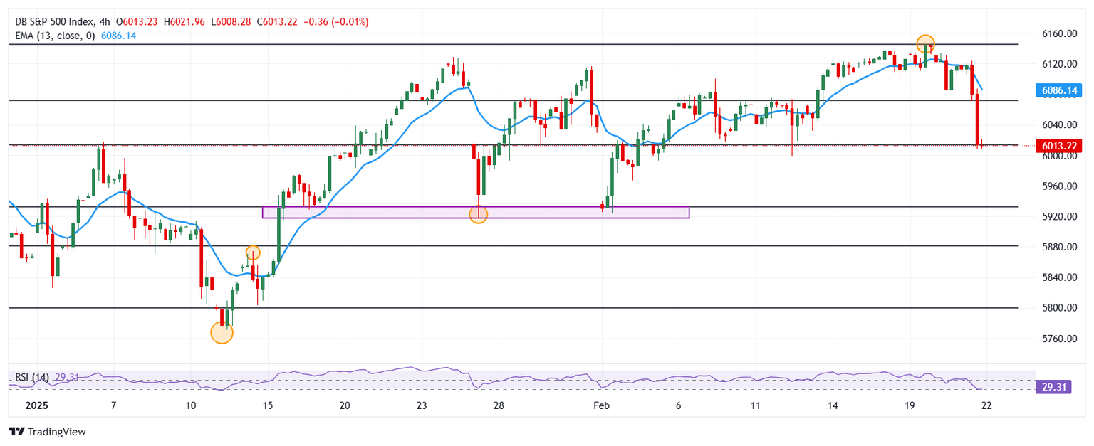El S&P 500 registró un máximo del día en 6124, atrayendo vendedores agresivos que arrastraron el índice a mínimos del 12 de febrero en 6025. Al momento de escribir, el S&P 500 cotiza en 6.027, cayendo un 1.46% el día de hoy.