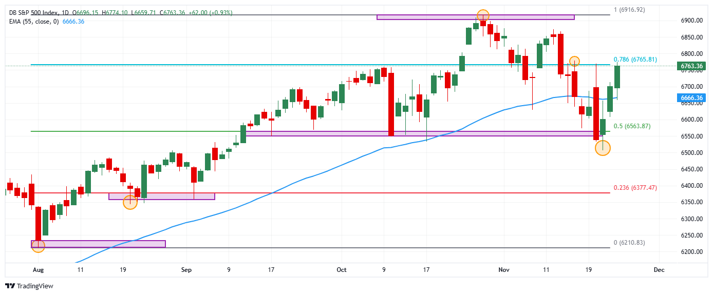 El S&P 500 registró un mínimo diario en 6.659, encontrando compradores agresivos que llevaron el índice a máximos del 20 de noviembre en 6.766. En estos momentos, el S&P 500 opera sobre 6.767, ganando un 0.98% en la jornada del martes.