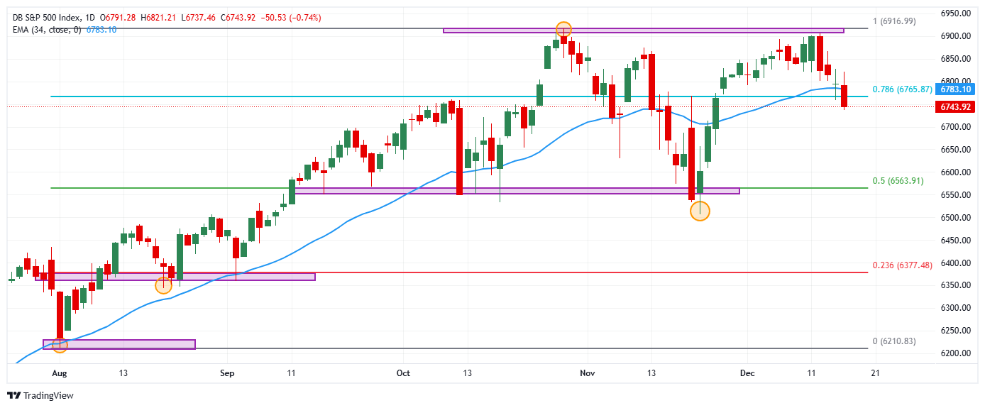 El S&P 500 reaccionó a la baja desde un máximo del día en 6.821, atrayendo vendedores que llevaron el índice a mínimos del 25 de noviembre en 6.737. Actualmente, el S&P 500 pierde un 0.63%, operando en 6.751.