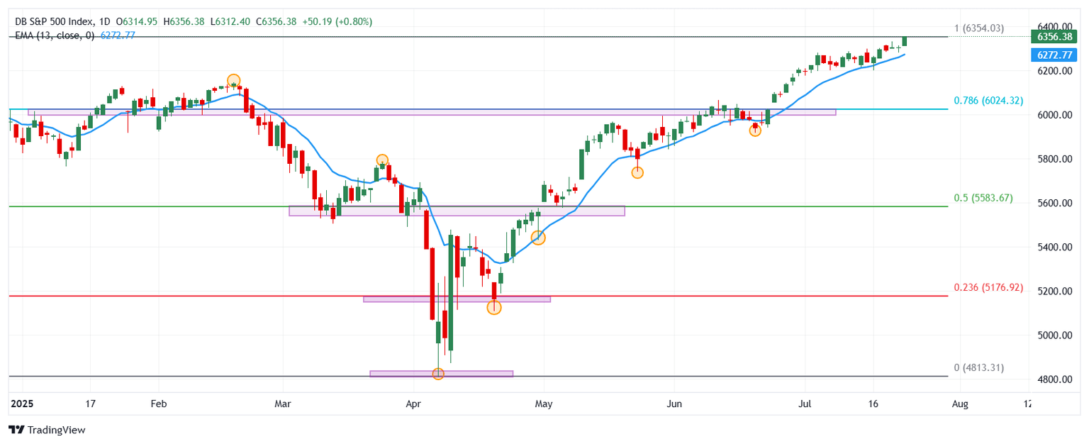 - El índice accionario S&P 500 gana un 0.80% diario, marcando un nuevo máximo histórico en 6.356.