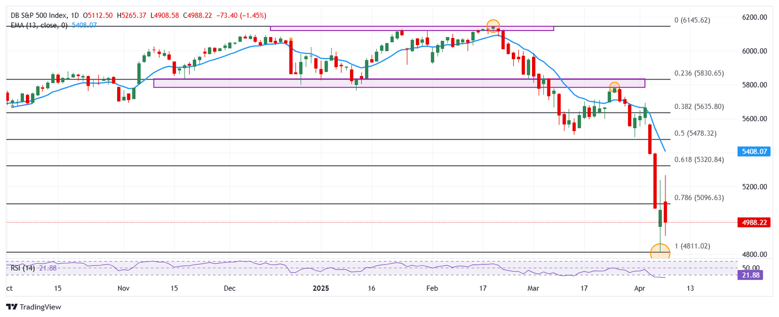 El S&P 500 reaccionó a la baja desde máximos del 4 de abril en 5.265, atrayendo vendedores agresivos que arrastraron el índice a un mínimo del día en 4.908. Actualmente, el S&P 500 opera sobre 4.988, cayendo un 1.45% el día de hoy.
