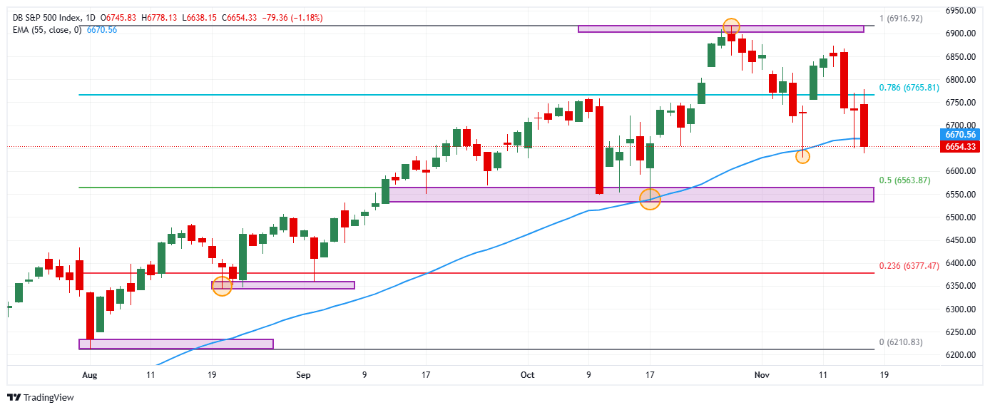 El S&P 500 reaccionó a la baja desde máximos del 13 de noviembre en 6.778, atrayendo a vendedores agresivos que arrastraron el índice a un mínimo del día en 6.651. En estos momentos, el S&P 500 cotiza sobre 6.653, perdiendo un 1.14% en la sesión del lunes.
