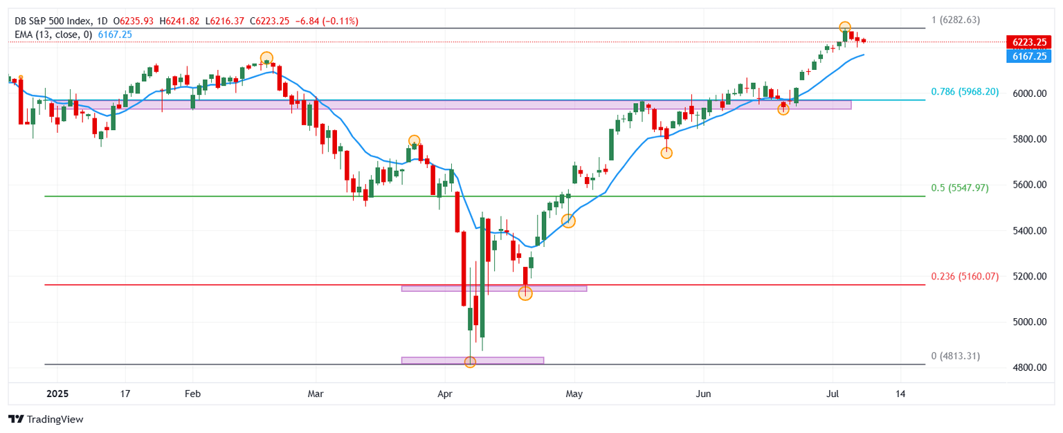 El S&P 500 estableció una resistencia de corto plazo dado por el máximo histórico alcanzado el 3 de julio en 6.282. A la baja, el soporte más cercano se encuentra en 5.917, mínimo del 19 de junio en convergencia con el retroceso al 78.6% de Fibonacci. El siguiente soporte clave lo observamos en 5.430, punto pivote del 30 de abril.