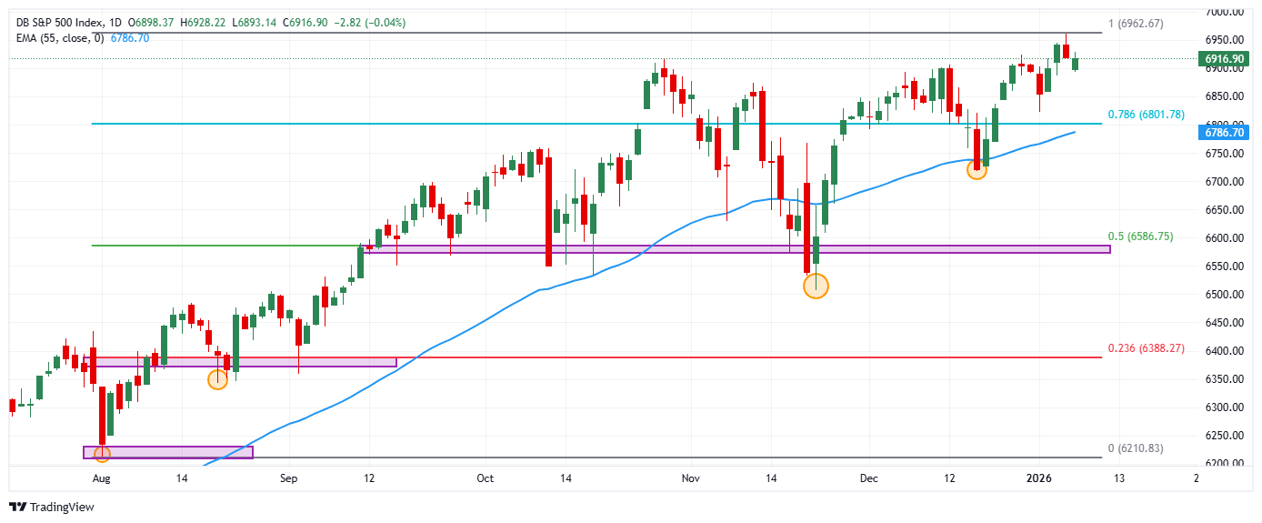 El S&P 500 rebotó desde mínimos del 6 de enero en 6.893, encontrando compradores que llevaron el índice a un máximo diario en 6.928. Actualmente, el S&P 500 cae un 0.04% diario, finalizando la jornada en 6.916.